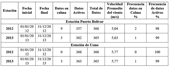 Los datos en calma en las mediciones realizadas (ver tabla 1) para la estación de Puerto Bolívar, se registraron para el año 2012, 9 datos equivalentes al 2.5 % del total de los datos en calma, para el año 2013 se registraron 3 datos, que equivalen al 0,8 %. para la estación de Usme en el año 2012 no se registraron datos en calma, siendo constantes las velocidades durante el año a diferencia del año 2013, que si se registraron 3 datos, equivalentes al 0,54 %. Las velocidades medias-bajas, son valores entre 1,5 m/s y 3,0 m/s (incluye la calma, la ventolina y brisa ligera, según la escala de Beaufort que expresa la fuerza del viento.