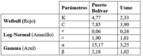 Para Puerto Bolívar, la distribución de Weibull (k = 4,77; C = 7,85), establece la distribución binomial, con base en las propiedades estadísticas mixtas; la distribución de Log-normal define los dos parámetros (α = 0,06; β = 1,9), con una diferencia en la distribución, ya que encaja los histogramas de los datos de la velocidad del viento, dada la distribución logarítmica, empleada en el algoritmo de cálculo, Por último se observa la distribución Gamma, donde sus dos parámetros (α= 15,17; β = 2,18), corresponde con el mejor ajuste de conjunto de datos, ya que esta variable aleatoria discreta, hace una descripción de la superficie, siendo esta un punto de comparación entre los datos reales y los datos previstos.