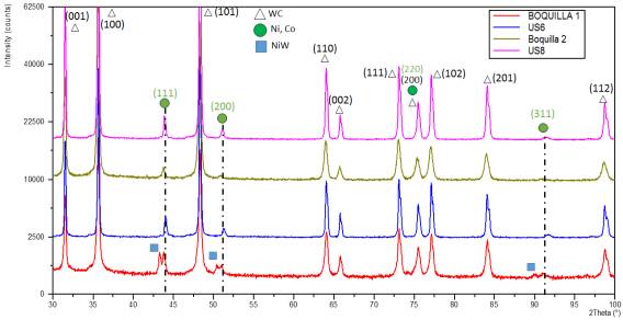 Los picos identificados coinciden para la fase hexagonal del WC con el patrón 510939. En la fase metálica de la boquilla 2 y la US8 se identificó una mezcla de fase metálica FCC que corresponde a los patrones 150806 para el cobalto y 030650380 para el níquel, respectivamente ; mientras que para las composiciones boquilla 1 y US6 sólo se identificó la fase correspondiente al níquel.
