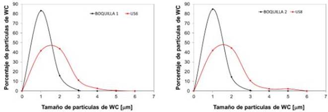 En la figura 5 se muestra la distribución de tamaño de grano de carburo de wolframio en las con composiciones 90WC8Co2Ni (Boquilla 1 y US6) y 94WC6Ni (Boquilla 2 y US8).