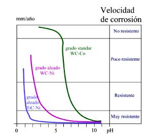 Los grados estándares basados en WC-Co son resistentes hasta pH 7. El grado TiC-Ni es el que muestra las mejores propiedades de corrosión siendo resistente hasta un pH 1 y en medio de estos se encuentran los grados aleados con níquel, los cuales presentan un comportamiento interesante hasta un pH 3.