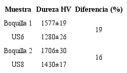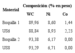 En la tabla 3 se muestran las microdurezas de los metales duros comerciales y sinterizados en laboratorio con composiciones 90WC8Co2Ni (Boquilla 1 y US6) y 94WC6Ni (Boquilla 2 y US8).