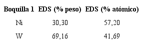 Es importante anotar que en la boquilla 1, se detectó una fase cúbica NiW, ver cuadro azul en la figura 4 compuesta de Ni y W (patrón 030654828) como se muestra en los análisis EDS mostrados en la tabla 2.