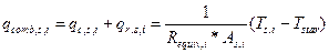 (3)Where Requiv is equivalent resistant between the wall with a node, Tstar: artificial temperature node, qc,s,I convection heat flux on the internal surface of the walland qr,s,I are the long wave radiation heat flux on the internal surface of the wall. Heat gain through radiation and convection for external surface were calculated by, equations 4, 5 and 6: