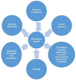 The TRNSYS interface interacts with the user as a graphic programming tool. This means that no previous knowledge of a programming language is necessary to create and run a simulation, although TRNSYS allows modifying its component models with several common programming languages. Component models refer to subroutines that the TRNSYS program libraries incorporate in its standard version, each subroutine models a specific component. The accuracy of a thermal simulation result is determined by the input data. This input data mainly consists of the building geometry, internal loads, HVAC systems and components, weather data, operating strategies and schedules, and simulation specific parameters, as show the figure 1.