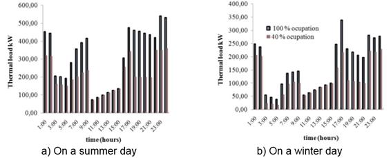 The values of occupation with the above considerations are: 60 rooms (40 % occupancy), spaced on the west side.89 rooms (60 %), located throughout the westside and in the upper floors from the eastside.119 rooms (80%), located on the west side and in almost the entire east side.149 rooms (100 %), hotel full occupied. figure 5 shows the load profile for each per cent of occupancyunder critical conditions during summer season.