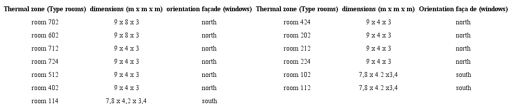 All thermal zones were modeled in TRNSYS. In this simulation environment, the thermal load of the resulting guestroom module is calculated as a function of: the comfort set point temperature, weather variables for the situated geographic zone, and the heat gains due to occupancy and equipment presented in the guestrooms. The physical description of the defined thermal zones is shown in table 1 and figure 3.