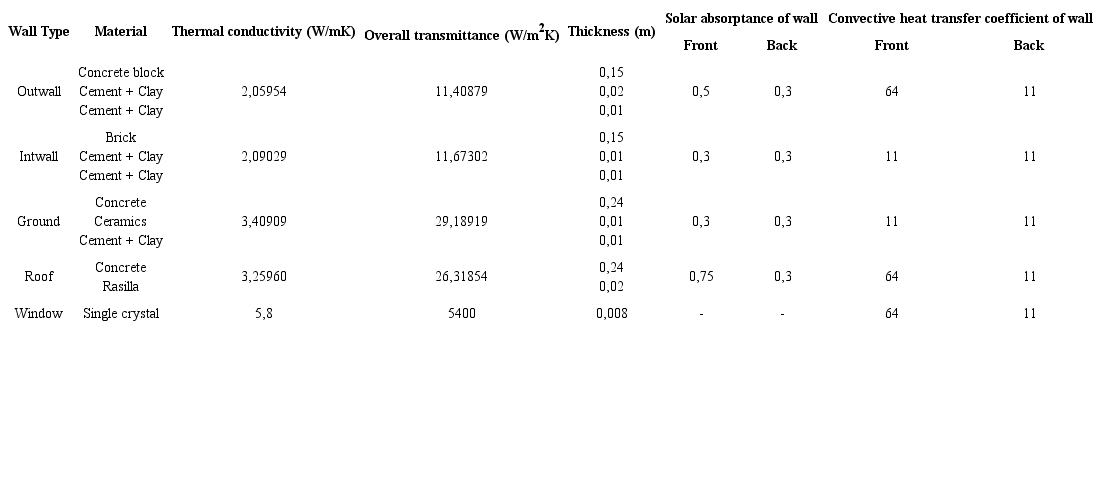 The building was simulated in TRNSYS environment, using the TRYNBUILD application, including in TRNSYS package. Four different walls were considered, whose values of transmittance and front and back solar absorbance are shown in table 2.