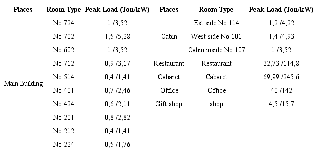The HVAC systems of the hotel are two water chillers model: CHAWT-1402-AT-BP-RC-100 C1-VT, the cooling capacity: 404 kW each. (115 TR) chilled water flow GW-70 m3/h. Temperature Input / Output: 11/6 °C. To calculate the thermal loads hotel, first it was divided by type rooms. They are classified according to their dimension, neighboring rooms, and the influence of solar radiation on the roof and external walls. Based on these criteria, 13 types of heating zones or rooms with very similar characteristics of thermal load were identified, as shown at figure 2.