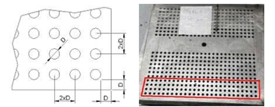 La figura 1 muestra el diseño del cuerpo de prueba con la perforación planificada. Las dimensiones de la probeta son 250 mm de largo y 220 agujeros con 26 mm de ancho con 22 agujeros. Todas las placas fueron fresadas en ambos lados para eliminar las irregularidades provenientes de la laminación. El espesor resultante de las muestras varió de 11,5 mm a 12 mm. La figura 1 muestra un detalle de la placa perforada.