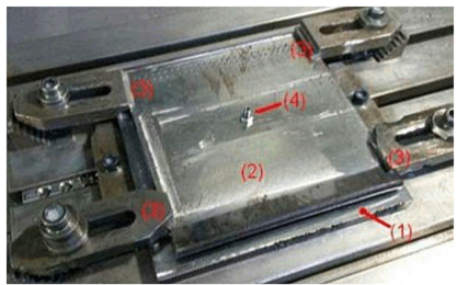Los cuerpos de prueba fueron fijadas en una base de acero rectificado con la ayuda de cuatro sujetadores en los extremos y un tornillo central. La figura 2 muestra el sistema de fijación. La base de soporte se muestra en la figura por el número 1. La muestra 2, las mordazas 3 y el tornillo central 4. Debido a la delgadez de las muestras se colocó el tornillo central para garantizar una fijación rígida. Las muestras se centralizan en la máquina, a través de la perforación central y guiados en el agujero de tornillo, fijado a la base, que se sujeta a la mesa de la máquina.