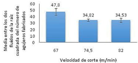 En el análisis realizado en el software con la raíz cuadrada del número de agujeros, el coeficiente obtenido de variación fue de 11,6 %, un valor aceptable para una distribución de datos con resultados significativos. Para los fluidos, y de acuerdo con la prueba F (número de grupos iguales a 2 y el número de observaciones igual a 18), el F calculado, igual a 0,586 (menor que el F esperado), no indica diferencia significativa entre ambos fluidos, teniendo en cuenta el número variable de agujeros perforados hasta la rotura de la herramienta. Para velocidades de corte (número de grupos = 3 y el número de observaciones =18), F es igual a 16,817 mayor que F esperada, esto denota la existencia de una diferencia significativa entre los niveles del factor velocidad de corte teniendo en cuenta el número variable de agujeros perforados hasta la rotura de la herramienta. Para la interacción entre velocidad de corte y fluido, el F recomendado es igual a 3,11. Como resultado, el F calculado es igual a 9792, mayor que el F recomendado. Por lo tanto, existe una interacción significativa entre los niveles de factores de fluido y velocidad de corte, a un nivel de significación de 5 %. Por lo tanto, hubo un hallazgo significativo: el número de orificios realizados con cada fluido depende de la velocidad de corte, así como el número de agujeros realizados para cada velocidad de corte depende del fluido utilizado. La prueba de Tukey hecha para comparar los dos fluidos, no mostró ninguna diferencia significativa entre el número medio de agujeros para los dos fluidos. La diferencia entre las medias estuvo por debajo de la diferencia significativa mínima que resultó ser de 4,65. En el análisis de las medias para cada una de las velocidades de corte, la velocidad de 82 m/min y 74,5 m/min, no mostró diferencias significativas. En cuanto a la velocidad de 67 m/min, el resultado fue superior a la menor diferencia significativa de 6,98. El número de orificios obtenidos a la velocidad de 67 m/min fue 38,5 % mayor que a la velocidad de 82 m/min y 37,3 % superior a la velocidad de 74,5 m/min. La figura 3 muestra la gráfica de los promedios de cada velocidad de corte, donde la velocidad de 67 m / min dio lugar a 37,9 % más agujeros en comparación de la media de los otros dos velocidades.