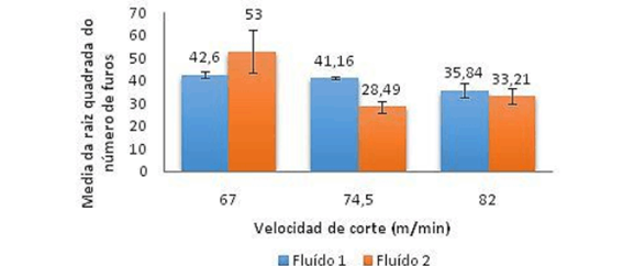 En la comparación para cada fluido en función de la velocidad de corte, la diferencia mínima significativa fue 8,06. Para una velocidad de 67 m/min, el fluido 2 Superedge 6552 arrojó una diferencia significativa de 24,4 % más de agujeros hechos en comparación con el primer fluido (aceite 351). Para la velocidad 74.5 m/min, el fluido 1 generó una diferencia significativa de 44,5% más de agujeros hechos en comparación con el fluido 2. En cuanto a la velocidad de 82 m/min, no hubo gran diferencia, siendo que la variación fue menor que la diferencia mínima significativa. El gráfico de la figura 4 muestra los resultados comparativos.