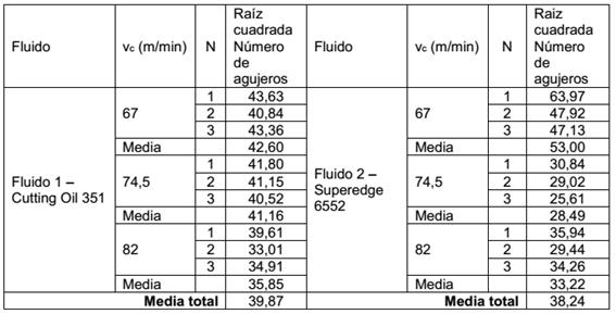 El primer análisis con el número de orificios realizados en cada condición, resultó en un coeficiente de variación del 33 %. Esta alta variabilidad hizo que los dos fluidos se presentaran estadísticamente iguales, mediante la prueba de Tukey. Esta variabilidad se justifica por la distribución del fluido en cada velocidad, se observó que no había ninguna diferencia significativa en la forma como este actuaba. Debido al gran coeficiente de variación, los resultados estadísticos no pueden ser concluyentes sobre las diferentes velocidades de corte y fluidos de corte. En la búsqueda de mejores resultados, se optó por el uso de una normalización de los datos usando el software mencionado. Se optó por la raíz cuadrada de los valores de los agujeros, como se muestra en la tabla 2.