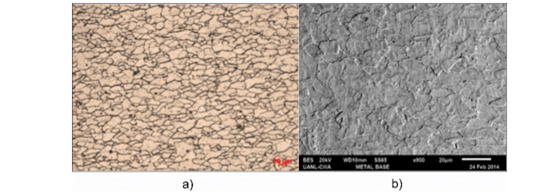 También se ejecutó un análisis de la micro estructura utilizando un microscopio óptico ZEISSTMAxio-Observer Z1M y un microscopio electrónico de barrido marca JEOLTM modelo JSM-6510LV a bajo vacío, usando el método de electrones retrodispersados (ver Fig. 1a y 1b). En la figura 1 se puede apreciar una estructura ferrítica característica de un acero de muy bajo por ciento de carbono.