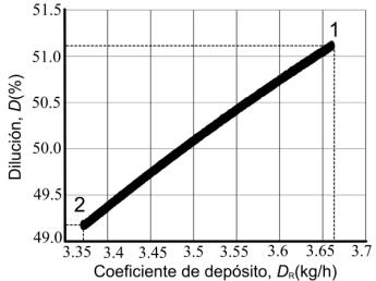 Como consecuencia de la optimización multiobjetivo, se obtiene el gráfico de Pareto (ver Fig. 3), que contiene todos los individuos no dominados. Los resultados mostrados demuestran que no existe una solución única, debido a que los dos objetivos considerados (la dilución y el coeficiente de depósito) son contradictorios entre sí, lo que se explica en que el incremento de uno causará el decremento del otro. Por lo que cada punto de la frontera de Pareto es considerado igualmente óptimo, pero la conveniencia de utilizar indistintamente uno u otro depende de las condiciones específicas de la producción.