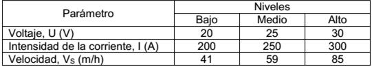 Como factores experimentales se tomaron los parámetros del régimen de soldadura: voltaje, U; intensidad de la corriente, I; y velocidad de la soldadura, VS . Para cada uno de estos factores se consideraron tres niveles: bajo, medio y alto, tal como se muestra en la tabla 1.