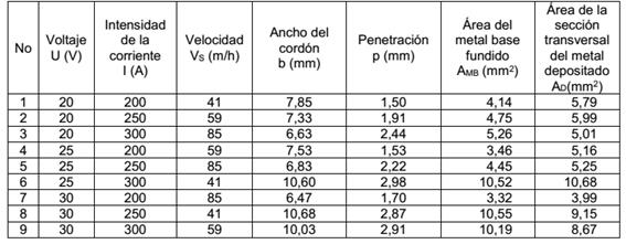(1)A partir del resultado anterior, se seleccionó un arreglo ortogonal L9 con nueve experimentos y ocho grados de libertad. Los valores del ancho del cordón (b), la penetración (p), el área del metal base fundido y el área de la sección transversal del metal depositado se obtuvieron por el método metalográfico (ver Fig.2 y Tabla 2), realizado a cada experimento. Las dimensiones de b y p fueron medidas con el microscopio óptico de platina invertida modelo Axio-Observer Z1m, utilizando el sistema digital de captura y procesamiento de imágenes que ofrece una precisión de ± 5 µm. Los experimentos fueron ejecutados aleatoriamente (ver Tabla 2).
