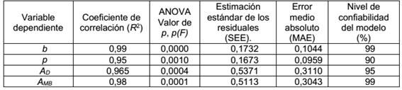 En la tabla 3 se muestran los coeficientes de correlación (R2 ) y los valores de probabilidad (p-value) asociados al análisis de varianza (ANOVA) hecho a cada modelo. Como se puede observar todos los modelos ajustados explican más del 95 % de variabilidad en sus respectivas variables dependientes, también se puede comprobar que como el valor de la probabilidad es menor que 0,01 existe una relación estadísticamente significativa entre la variables a un nivel de confiabilidad del 99 %.También se puede corroborar que los errores asociados a la calidad de los modelos (SEE y MAE) poseen valores pequeños lo que garantiza una mejor aproximación en las predicciones.