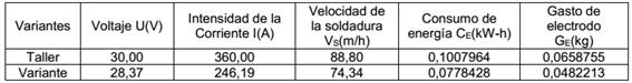 Para la validación del método de optimización propuesto se seleccionó de la gráfica de Pareto una variante correspondiente a un punto medio de la curva. Esto permitió realizar la comparación con los parámetros utilizados, además se pudieron calcular los indicadores de consumo de energía y gasto de electrodo. Los resultados se muestran en la tabla 4.