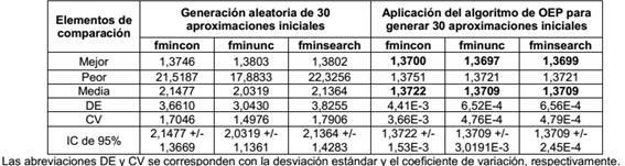 A partir de la tabla 10, se observa que cuando se utiliza el algoritmo de OEP para determinar la aproximación inicial para los métodos de PNL, se logran menores errores de ajuste, que los que se obtienen mediante la generación aleatoria de aproximaciones iniciales. Este resultado fortalece la idea de que la generación de la aproximación inicial a través del algoritmo de OEP mejora el desempeño de los métodos de PNL en el ajuste posinomial.