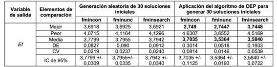 Para la descripción del comportamiento de la eficiencia se considera un posinomial con 4 términos, mientras que para CA y TZ, se seleccionan los modelos posinomiales con tres términos. A continuación se presentan los resultados del ajuste posinomial a través de los métodos clásicos, con y sin la aplicación del algoritmo de OEP para generar las aproximaciones iniciales, para las tres variables de salidas: