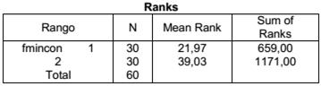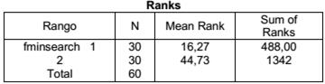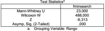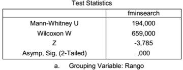 Al aplicar las pruebas no paramétricas de Mann-Whitney, se observó que las diferencias en las tablas 2, 3, 4 y 5, entre los errores de ajuste posinomial obtenidos, con y sin la aplicación de la metaheurística, son significativas. A este resultado se arriba, empleando el software SPSS Statistics, al observar que el valor de la probabilidad asociada fue menor que el nivel de significación de la prueba α = 0,05 en todos los ejemplos considerados. Lo anterior conlleva a que se debe rechazar la hipótesis nula en todos los problemas aquí tratados, o sea, hay evidencias estadísticas suficientes para rechazar la idea de que no existen diferencias significativas entre los errores de ajuste posinomial, obtenidos con y sin la aplicación de la metaheurística, con un nivel de confianza de 95 %. En las tablas 6 a la 9 se presentan los resultados de las pruebas no paramétricas de Mann - Whitney en el análisis de los errores que se generaron a través de las funciones fminsearch y fmincon, con y sin la aplicación de la metaheurística, en la estimación de CM y de Ef: