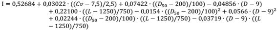 The Standard Interval Global Engine (SIGE) method, as defined by [15], was applied to obtain the optimal combination. Table 2 shows the optimal combinations of the independent variables for the pumping systems analysed in the range of investigated values. From these results, it is possible to observe that the optimal values for optimizing (minimizing) I are as follows: Cv=5 % (lower level), D50= 100 mm (lower level), L = 500 m (lower level) and D varying between 9,39 in and 9,17 in as a function of the pumping system. As is well-known, this value of the diameter is not a normalized value. Earlier statistical analysis established that 9 in. is the optimal value, but from a practical point-of-view, it is not possible to meet this condition. Therefore, a value of 10 in. was selected. This result is in agreement with the physical foundation of the study phenomena, as previously discussed.