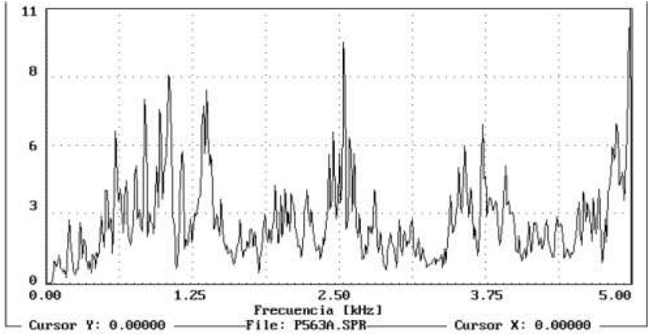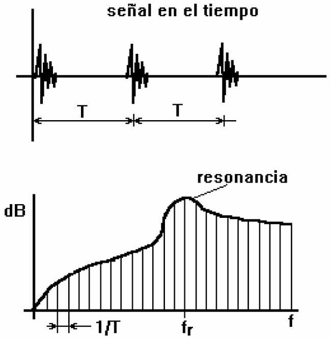Because of these impulse trains, natural frequencies in the block are excited, producing a non-continuous spectrum, formed by peaks with a frequency separation that depends on the time T between impulses. The figure 13shows what will be expected in a 1 DOF system.