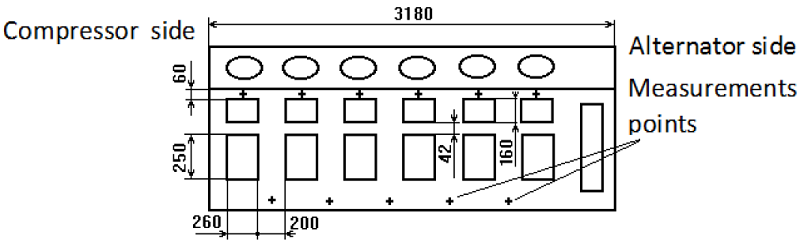 The model has an absolute reference system, with axes in the way more adequate. Nodes are placed in the junctures between block parts. Only the main dimensions of block components are considered. The last task is to establish the model movement restrictions, according to reality. To obtain a FRF in MSC/pal-2 is necessary to simulate a sinusoidal force with constant amplitude and discrete variable frequency in the node selected as system input. The effect is similar to a dynamic exciter fixed in the same point and fed with a signal generator, which produce a sinus with the same characteristics. General block dimensions and positions of measurements points in both model and engine are in figure 5 and figure 6.