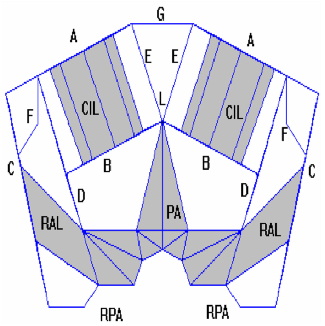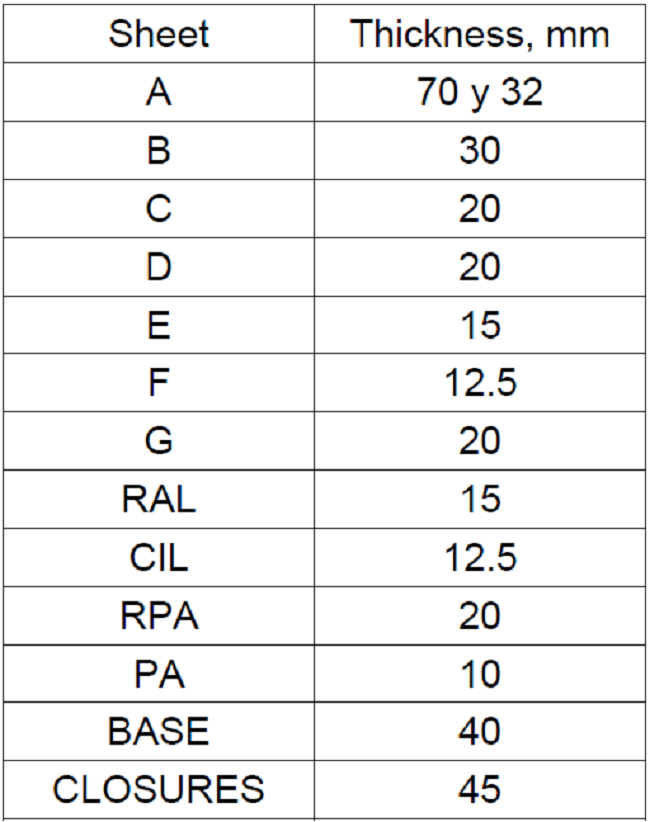 Cylinder are placed between upper side A and a sheet B parallel to A, which not touch the external lateral side C, and welded to another inner sheet and parallel to C, D. This sheet serves as support for crankshaft bearings PA, together with central line L and a series of reinforcements RPA. Among cylinders, and C and D the block has reinforcements RAL, which sustain the camshaft, one in each side. Bores in these sheets were not considered. The curved inner sheet F along the block do not reach extremes and pass behind the fuel collecting tube. Sheets E, G makes a tunnel all along, closed in the alternator side, by which air coming from compressor communicate with each cylinder. Sheet A has a bigger thickness near to cylinders, figure 7.