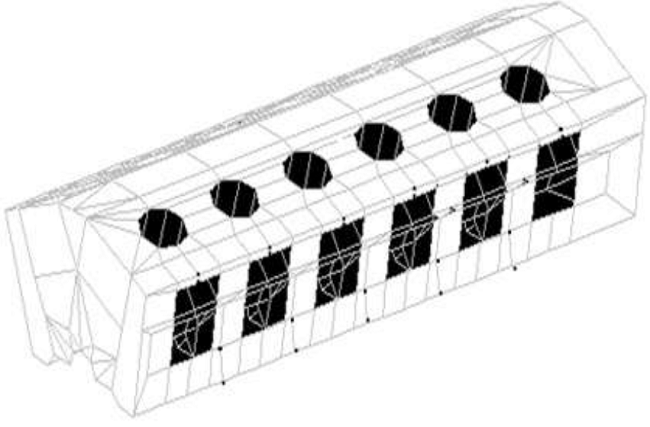 Sheet thickness are in table 2, the whole structure is made from welded sheets, except support point, which combines cast ant welded parts. The model do not consider some lateral apertures and a set of small holes for water connection. The FEM model file has 948 element, 666 quadrilateral type and 282 triangular type, placed in 798 nodes. A model view is in figure 8.