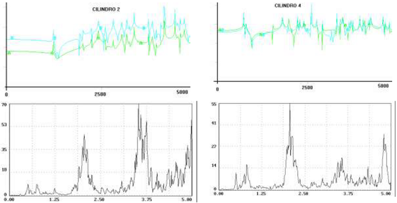 In general, the engine with more wear shows an increased background noise, proper to the character of sliding pairs. It is very clear that in some case, these frequencies are close to the cylinders frequencies. This will be a trouble when differentiation between sources is needed. Only further experimentation will solve this problem.