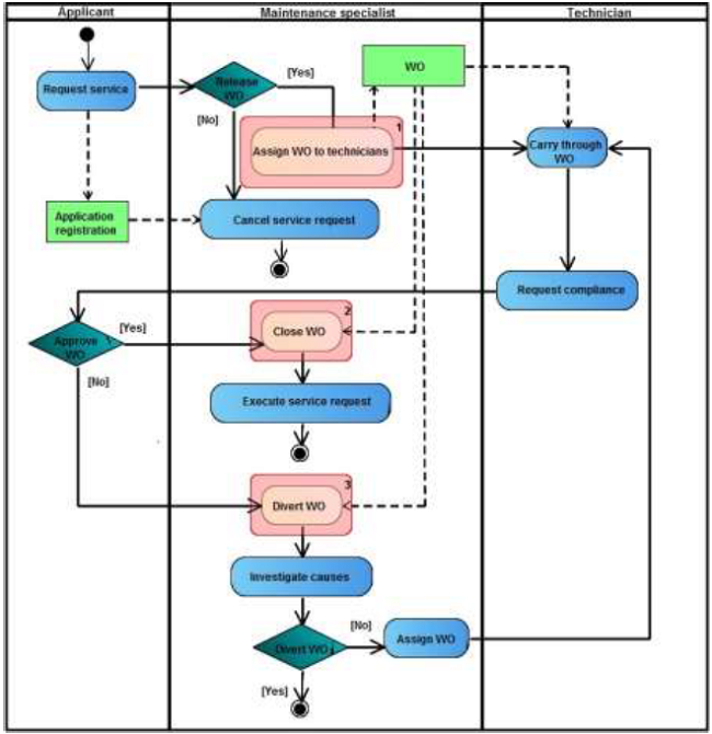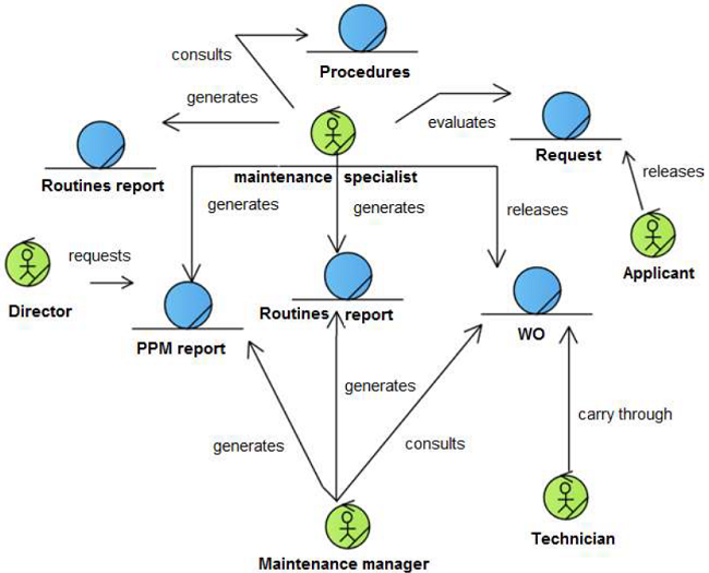 When a fault occurs or it is necessary to perform another kind of intervention, the worker in charge of the area or the asset where the work must be performed (applicant), registers his technical service request; through the GEMA computer application. Next, one of the maintenance specialists analyzes the technical service request and decide to issue or not a work order. This is a key aspect in the process. Traditionally, is it assign erroneously the responsibility of issuing a work order to the department secretaries.
