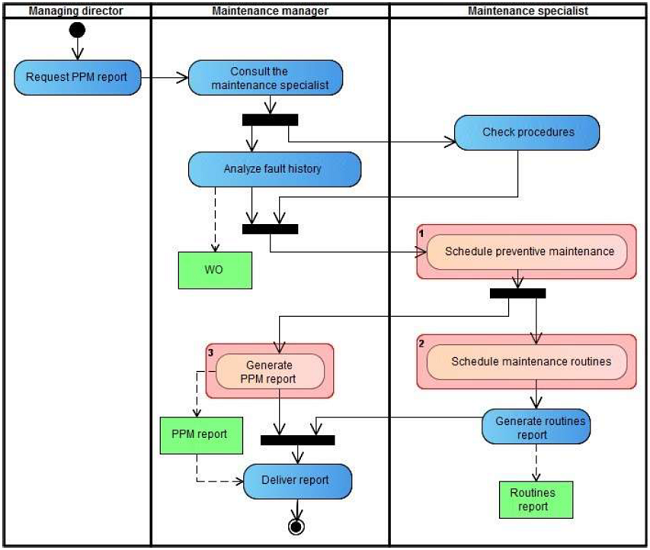 The interventions and changes of some components or parts to the assets, are programmed based on an analysis of the frequencies, the nature of interventions recommended by the manufacturer or maintenance specialists and break history of each asset. In other words, this is the Evidence-based asset management model. The necessary data for the analysis are obtained by consulting the work orders in the GAME computer application. Parallel to planning preventive maintenance, it is carried out planning maintenance routines. Its purpose is to offer a series of steps (standard) attached to the work order to guide maintenance technicians in the execution of planned preventive maintenance In other words; it is the beginning of Condition-based maintenance model. The maintenance manager and the maintenance specialists carry out planning preventive maintenance and planning maintenance routines. At beginning of each year the director of the company demand the maintenance manager for a report with the planning of preventive maintenance, taking into account the strategic management model adopted by the maintenance department (it is the responsibility of the entire company to optimally operate their assets). Finally, the shaded and numbered activities 1, 2 and 3 were reprogrammed in the GEMA computer application. The execution time to develop these activities manually exceeded 40 working hours per week; however with the computerization of these processes is achieve a reduction in the order of minutes