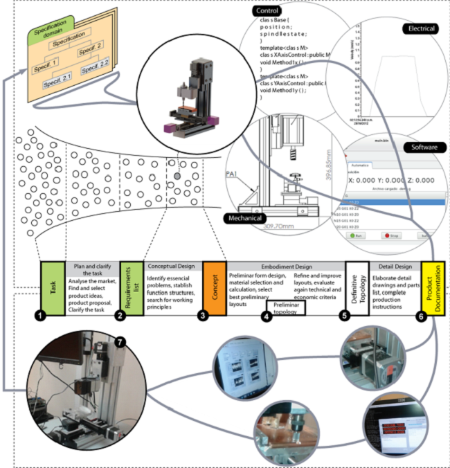 Finally, the conclusive stage of the design process (6) compiles all the information necessary for the manufacture and assembly of the physical prototype (7), which must meet the expectations and functional requirements of a mechatronic product, as analyzed previously.