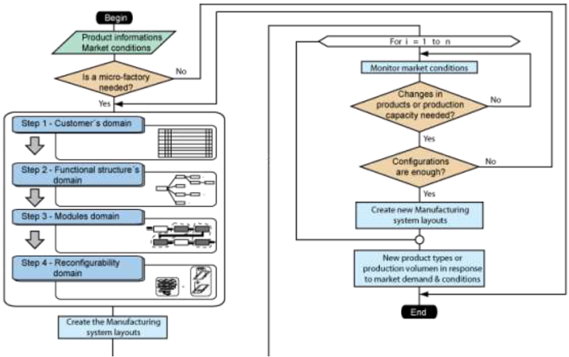 The framework consists of four stages. Step A begins the process of searching for the information needed for decision-making, regarding whether or not to develop a micro-factory. If the decision is to build a micro-factory, it goes to step B. At this stage are created different possible configurations of the micro machine tools that conform the micro-factory, according to the established requirements. Stage C defines the different layouts that could form the micro factory according to the identified needs. Finally, stage D makes the process of monitoring needs in order to reconfigure the micro-factory in terms of the new needs identified [17].