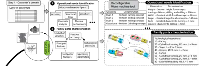 The operational needs identification must be catalogued in: accuracy of the micro-machines and the micro-parts to be machined, structural characteristic of the micro-machines, vibration characteristics, preliminary kinematic analysis, thermal performance, and so forth (2), figure 3.An important element in this phase is the characterization of the family of parts to be produced, an essential element in defining the reconfigurability of the RμM2Ts, based on knowing the typical technological operations that must be performed. We can identify and evaluate these two aspects based on the information that the client has, and which is evidence using specialized tools such as:DSM (Design Structure Matrix) [18], Kano [19] and QFD(Quality Function Deployment) [20].