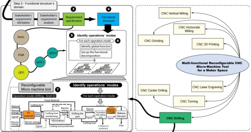 This domain has the purpose of transforming the customer needs (3) analyzed in the previous step, in a functional structure of the RµM2T. The main elements that influence in the determination of the functional structure of the RµM2T (7) are the technological processes defined in the previous step of the methodology. This domain includes two key activities. The first one, is related to the identification of the operating modes of the RµM2T (5). Each operating mode characterizes the functionalities of the RµM2T, in response to the range of the technological processes defined.For each mode of operation, we have to identify the global function and set up the functional decomposition. Once concluded this process, we have a set of functional structures (4), in response to each mode of operation (6) (Figure 3).