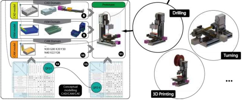 The figure 4 shows the case study of a reconfigurable micro machine tool, in the configuration of vertical micro drill. We can see the process of transforming information preferably of semantic type (1 and 2) with a high degree of uncertainty, contained in the domain of the requirements, to a functional physical prototype (7). We can observe the classical structuring of the prescriptive design, where an iterative process occurs from the decision making to the selection of the concept (3). This figure graphically represents the way in which the requirements are evolving and how they are gradually being synthesized until they we see it in the selected concept. In this analysis, we can use the CAD/CAE (Computer Aided Design/Computer Aided Engineering) tools to validate the fundamental parameters of the virtual prototype. This prototype possesses, intrinsically, the functional requirements of a mechatronic product (requirements related to the domains: electrical, control, software and mechanic).