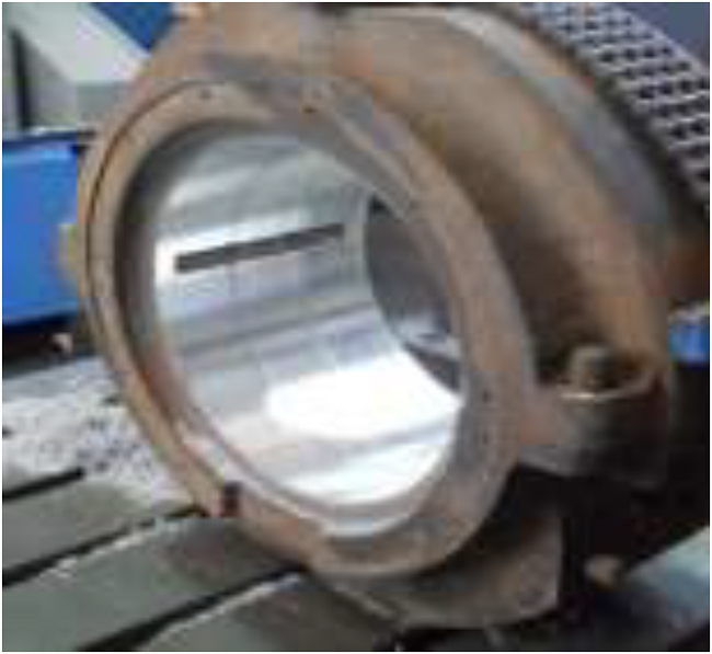 Para la realización de los experimentos se utilizó una chumacera de apoyo de los rotores de las turbinas con una superficie de contacto de diámetro 300 mm y longitud de 210 mm, con un espesor de capa de material Babbitt de 25 mm, el cual fue depositado por el método de centrifugado. figura 1.