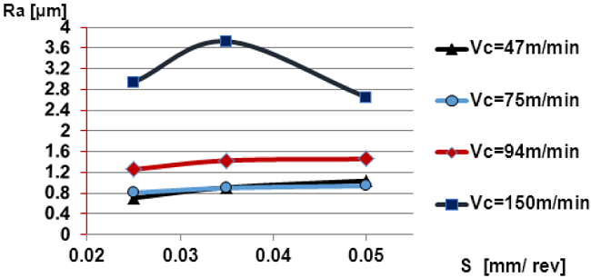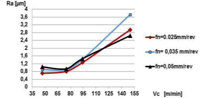 En la figura 4, se observa un comportamiento clásico de la influencia de la velocidad de avance en la magnitud de la rugosidad superficial en total correspondencia con lo planteado en la bibliografía, observándose que en la medida que aumentan los valores de avance empeora la calidad superficial. Se debe destacar que las curvas de rugosidad vs avance, presentan una pequeña pendiente de variación, en este caso, motivado por el rango pequeño de los valores límites. En este caso mejora el valor de rugosidad: Ra = 0,71 µm, coincidió con el menor valor del avance y velocidad de corte experimentados 0,025 mm/rev; y 47 m/min, lo que da respuesta a los objetivos planteados.
