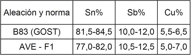 El material a maquinar es una aleación blanca, Babbitt, con el código AVE- F1, cuya composición química es semejante a la del B83 según norma GOST 1320, tabla I.