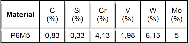 Como herramienta se usó una barra cilíndrica diámetro 20 mm de acero de corte rápido (HSS) P6M5 según GOST 9373-60. La composición química se expresa en la tabla 2.