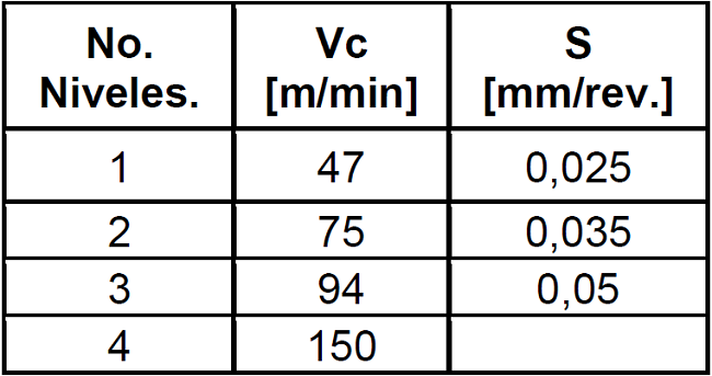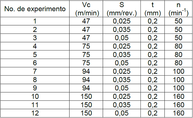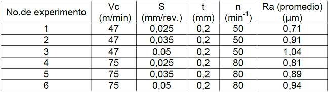 Para la realización de los experimentos de medición de la rugosidad superficial, se concibió un diseño experimental de 12 experimentos, con cuatro niveles de velocidad de corte y tres niveles de velocidad de avance, como se muestra en la tabla 4. El valor de la profundidad de corte se asumió constante t = 0.2 mm. Los experimentos se realizaron en seco. En la tabla 5 se presenta la el orden y las variables de cada experimento.