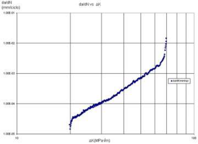Las gráficas de las probetas PGF, pruebas de grietas por fatiga, sin soldadura, figura 9, elaboradas con los datos que se obtuvieron de las pruebas en probetas del material sin cordón de soldadura, muestran una tendencia semejante aunque expresan cierta discrepancia que no se considera importante. Según muestra la gráfica, la región de crecimiento estable de la grieta inicia aproximadamente en 25 ΔK