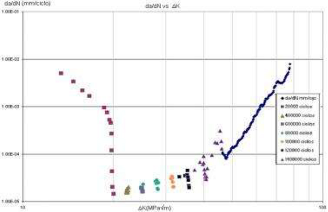 Se considera probable que este comportamiento inicial de disminución de la velocidad de propagación de grieta por fatiga en las piezas con cordón de soldadura, pudiera deberse a una combinación de la microestructura de la zona afectada por el calor y a la presencia de esfuerzos residuales. Cuando el tamaño de grano del acero es grande, la velocidad de propagación es menor que en el caso de una microestructura de grano fino, debido al efecto del fenómeno de cerradura de grieta inducida por la rugosidad de la superficie de fractura [5]. Otro factor son los esfuerzos residuales debidos al proceso de soldadura. Son esfuerzos de compresión por lo que se contrarresta con los esfuerzos de tracción produciéndose un K efectivo menor que el que se le aplica en la punta de la grieta [6]. Para la determinación de las constantes o coeficientes de Paris se determinaron mediante procedimientos numéricos empleando modelos a escala de las variables implicadas.