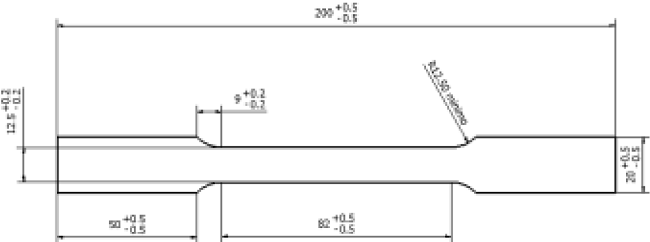 Para el ensayo de tracción y también mediante el proceso de electroerosión por hilo, se fabricaron 16 probetas del acero PTR calibre 14, de acuerdo a la Norma ASTM E08 - 00. La figura 2 muestra el esquema de las probetas que se ensayaron.