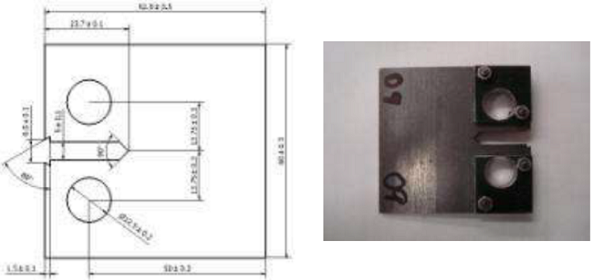 Las probetas empleadas para estos ensayos fueron del tipo CT (Compact Tension) de dimensiones: ancho W = 50 mm y espesor B = 2 mm, cuya geometría se muestra en la figura 3. Todas las probetas fueron obtenidas de una misma chapa y fabricadas según las recomendaciones de la norma ASTM E647-05, con el proceso de electroerosión por hilo.