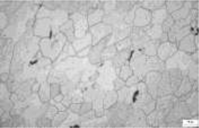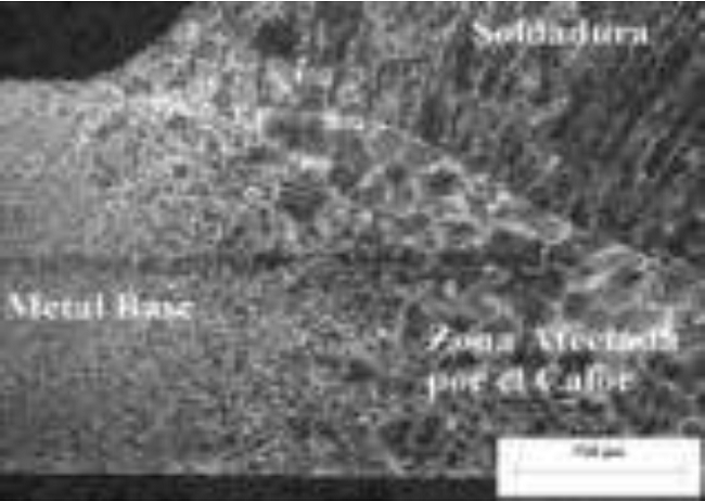 En la figura 4 se muestra la microestructura del metal base, tabla 2, que presenta una estructura característica de ferrita más perlita predominando la fase ferrítica, lo que corrobora que se trata de un acero de bajo carbono. En la figura 5 se muestra la microestructura de la soldadura característica de un material solidificado. En la zona afectada por el calor se distingue la presencia de granos grandes producto del crecimiento provocado por el calentamiento, una zona de transición y el metal base.